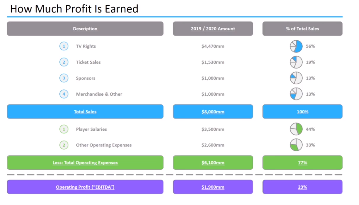 The NBA has 2 main categories of expenses (1) Player Salaries and (2) Operating Expenses. For the 2019 / 2020 season, the NBA had ~$6.1bn in total expenses.