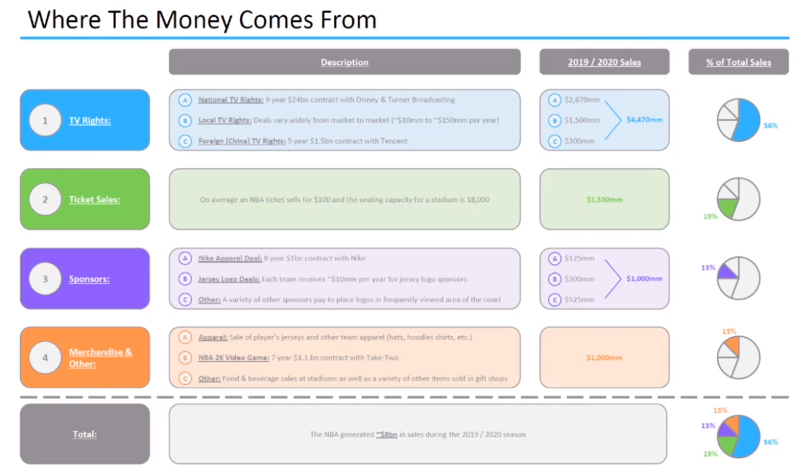 Now putting it all together, the NBA makes money in 4 different ways (1) TV Rights, (2) Ticket Sales, (3) Sponsorships and (4) Merchandise and Other Sales. In total, the NBA generated ~$8bn in sales during the 2019 / 2020 season.