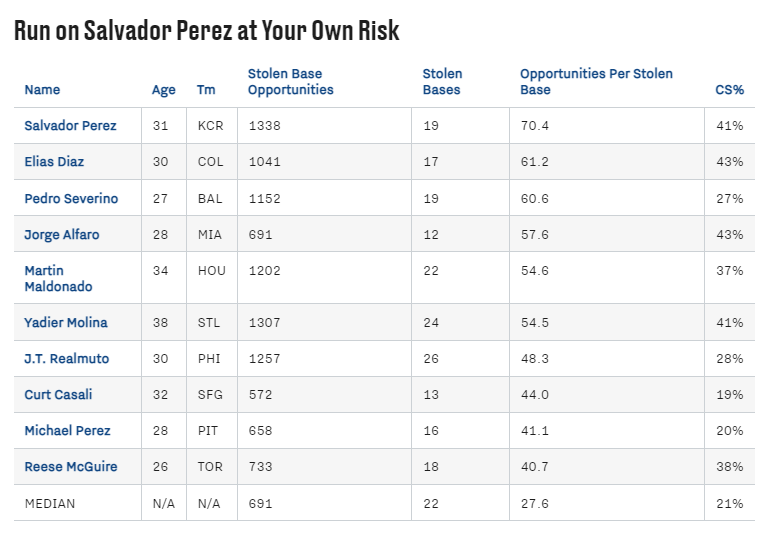 “Opponents have had the opportunity to steal a base 1,338 times on Perez this year. However, Perez has only allowed 19 successful stolen bases.