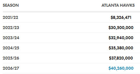 On 8/3/21, Young signed a contract extension for 5-years and $207 million dollars, the rookie maximum extension. Technically the base contract level is $172 million, but it includes a 30% escalator clause that boosts the value to $207 million if Trae makes one of the three All-NBA teams.