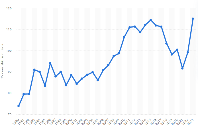 For example, the 2022 Super Bowl featuring the Rams defeating the Bengals averaged 101 million total viewers.