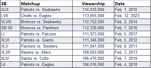 Here are the top 10 most-watched Super Bowls prior to LVII in 2024: