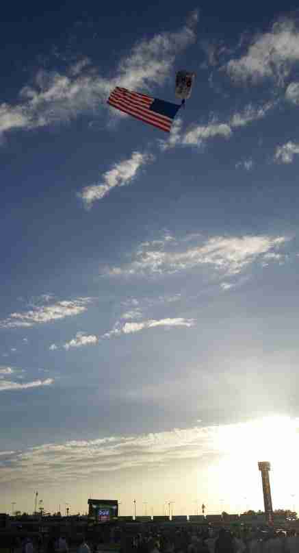 What’s more American than a NASCAR race? A guy parachuting out of a plane with an American flag at a NASCAR race: