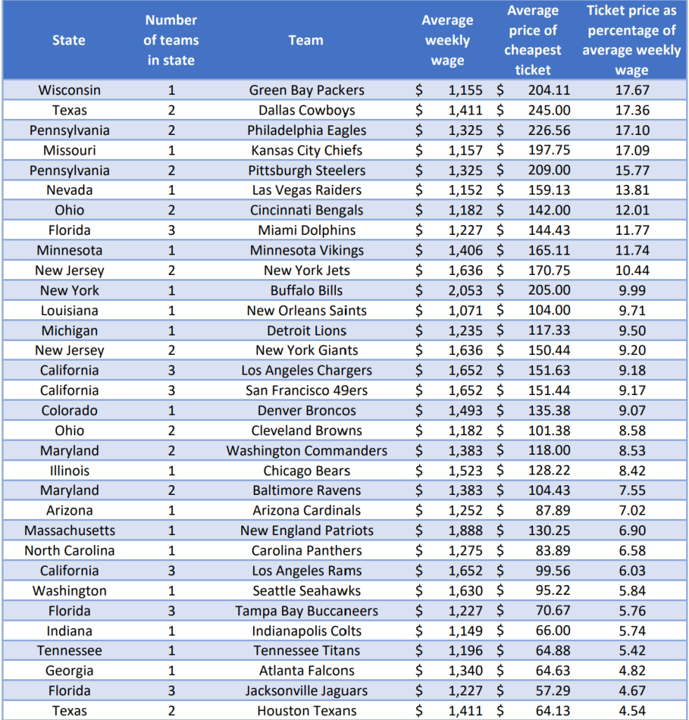 The Dallas Cowboys’ average cheapest ticket is $245, which is the highest cost in the league, but it equates to 17.36% of the $1,411 average weekly wage in Texas, putting the Cowboys in a close second to the Green Bay Packers.