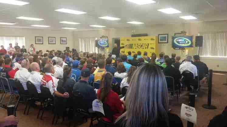In true NASCAR fashion, the setup is humble. Inside a small room, rows of chairs you’d find in any church basement are lined up, facing the front of the room.