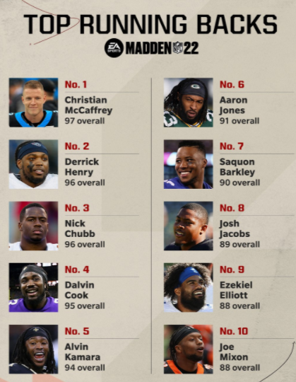 Madden 22 Rookie Ratings | Madden 22 Quarterback Ratings |Madden 22 Wide Receiver Ratings | Madden 22 Running Back Ratings | Madden 22 Tight End Ratings | Madden 22 Safety Ratings | Madden 22 Cornerback Ratings | Madden 22 Edge Rusher Ratings | Madden 22 Defensive Line Ratings | Madden 22 Linebacker Ratings | Madden Team Ratings