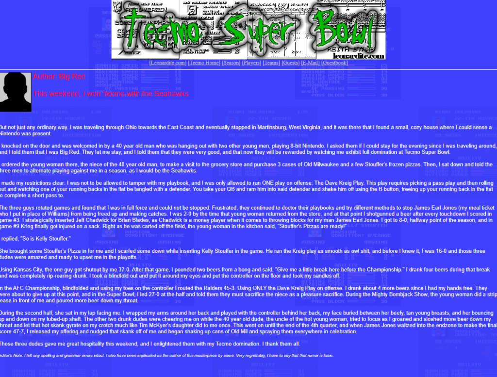 This story, by the formidable “Big Red,” has existed in the Tecmo Super Bowl NES underground for years. (for more on that world visit https://tecmobowl.org/)