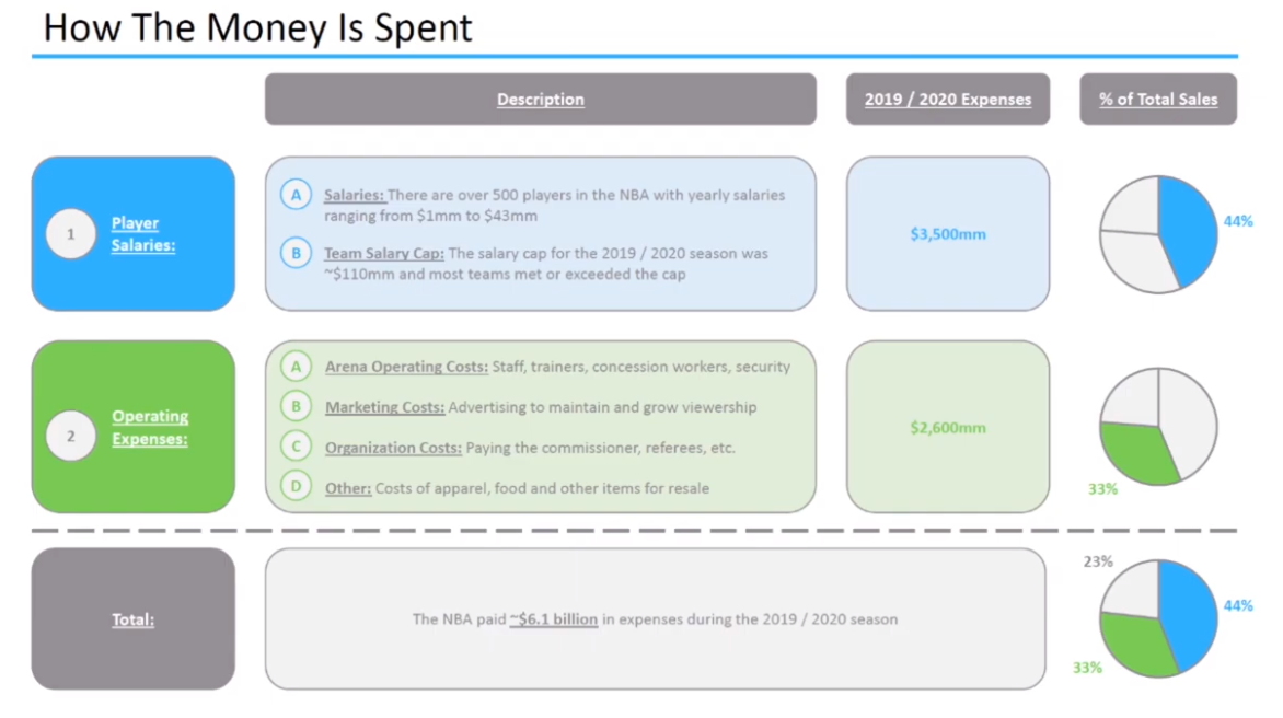 The NBA has 2 main categories of expenses (1) Player Salaries and (2) Operating Expenses. For the 2019 / 2020 season, the NBA had ~$6.1bn in total expenses.