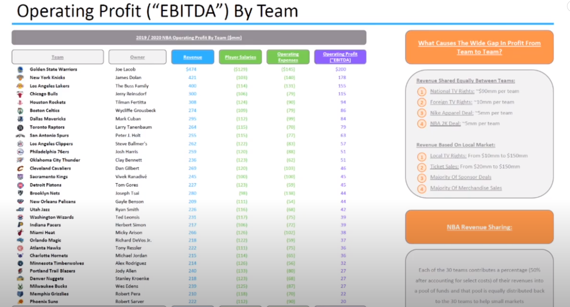 This left the NBA with an operating profit of ~$1.9bn. Now lets look at how the operating profit is divided between the teams.
